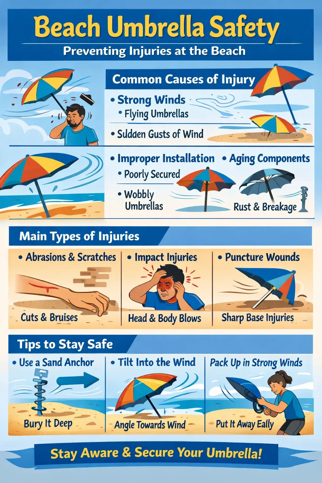 Accidental Puncture Wounds: Because many beach umbrellas have very sharp bases for easy insertion into the sand, this sharp point becomes very dangerous if the umbrella is blown across the ground by the wind.