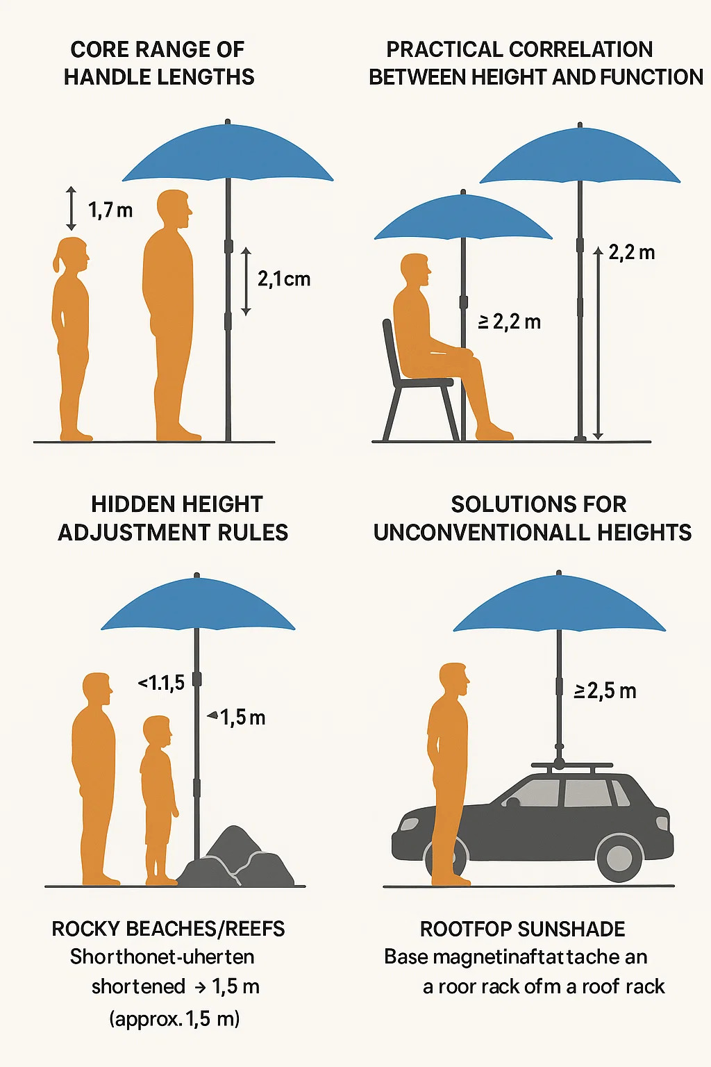 Multi-person sun protection models: The handle extends to the height of the raised arm over the head + 20cm (approximately 2.1 meters), ensuring that the umbrella does not hit the head when standing or walking.