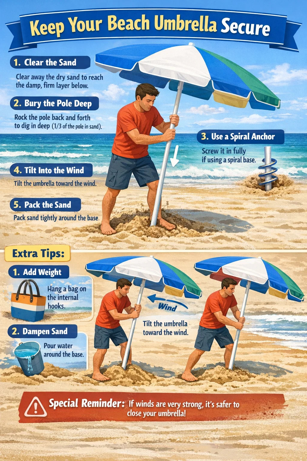 Don't just push it straight down: Many people simply push down hard, but this doesn't bury it deep enough. The best way is to hold the umbrella pole, press down firmly, and rock it back and forth vigorously, allowing the pole to "drill" into the sand like a drill bit.