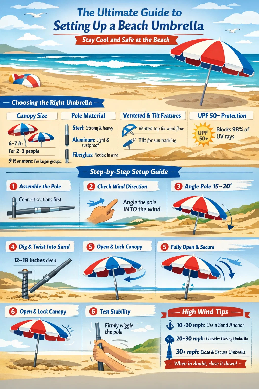 Setting up a beach umbrella correctly takes less than five minutes once you know the steps — but doing it wrong means your umbrella tips over in the wind, fails to provide shade where you need it, or worse, becomes a hazard to nearby beachgoers. The core process: choose a wind-protected spot, angle the pole 15–20 degrees into the wind, sink it at least 12–18 inches into the sand, and secure it with a sand anchor or by twisting the pole deeper. Everything else builds on that foundation.