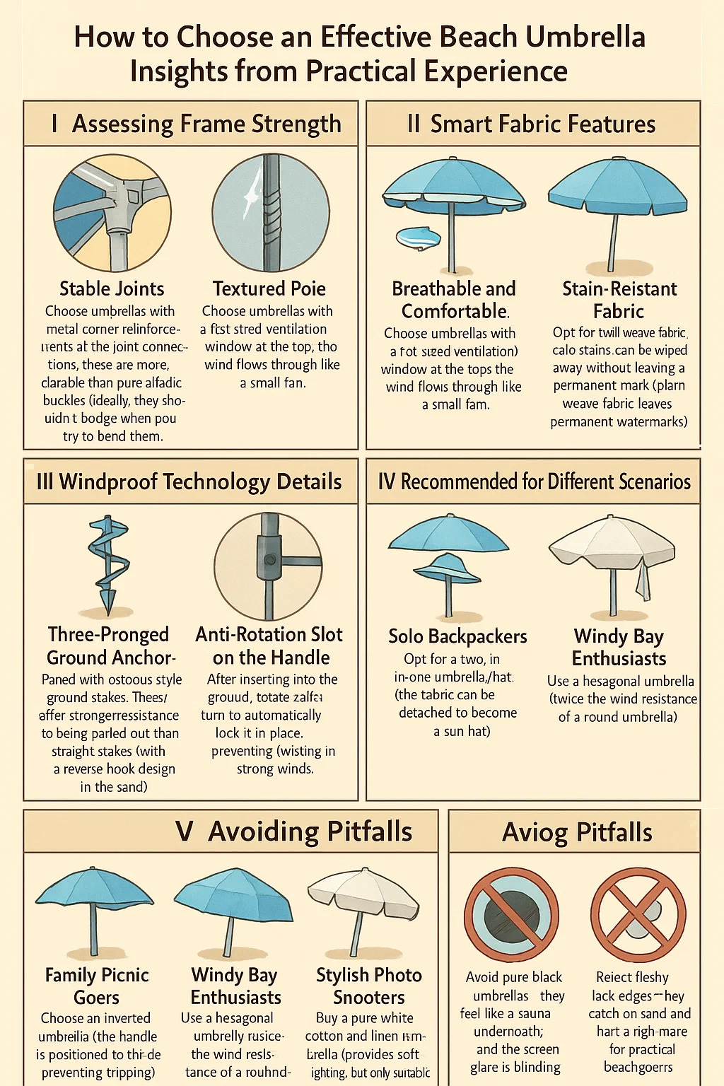 Here are the key points for choosing a truly effective beach umbrella, explained with practical experience: